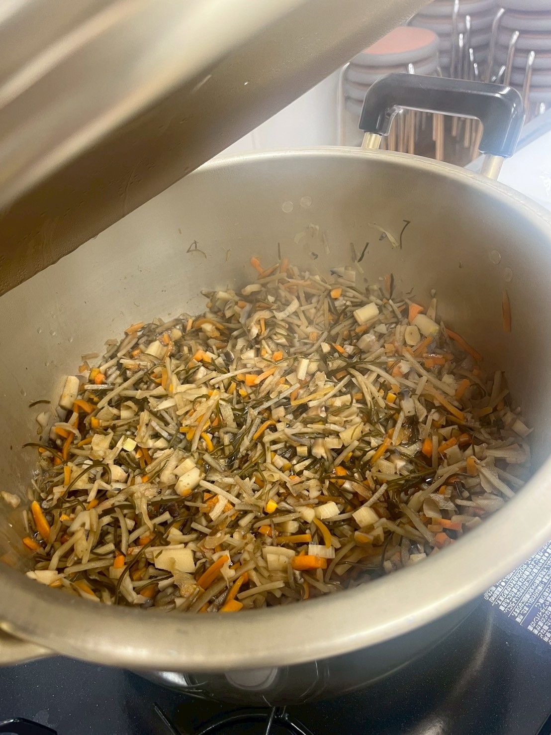 一層目は五目寿司、にんじん、椎茸、れんこん、ごぼう、筍、昆布などを炊いて酢飯に混ぜ込みました。色々な食感が楽しめる層👍