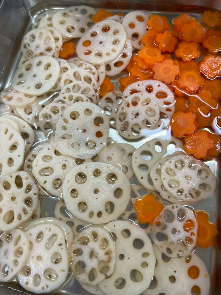 そぼろ、いり豆腐(クチナシの実で黄色にして、いり卵風)、お酢でしめた桜にんじん🥕、れんこん、たけのこで飾り、桜でんぷんを添えて、お祝いの気持ちが届くよう、ちょっぴり華やに仕上げましたよ🌸